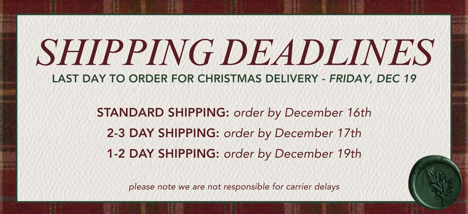 last day to order for Christmas delivery - Friday, Dec 19 via express (1-2 day) shipping