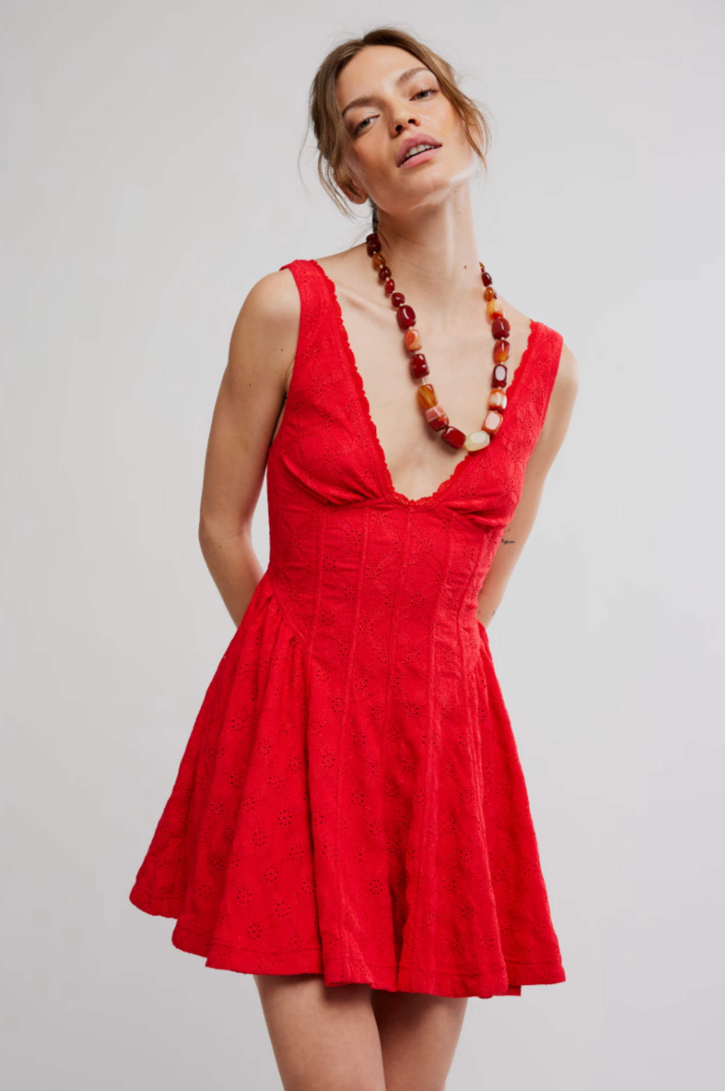 • Sweet meets sultry in this striking mini dress featuring a charming eyelet lace fabrication, a corset-style bodice, and a swingy A-line skirt for an effortless feel.