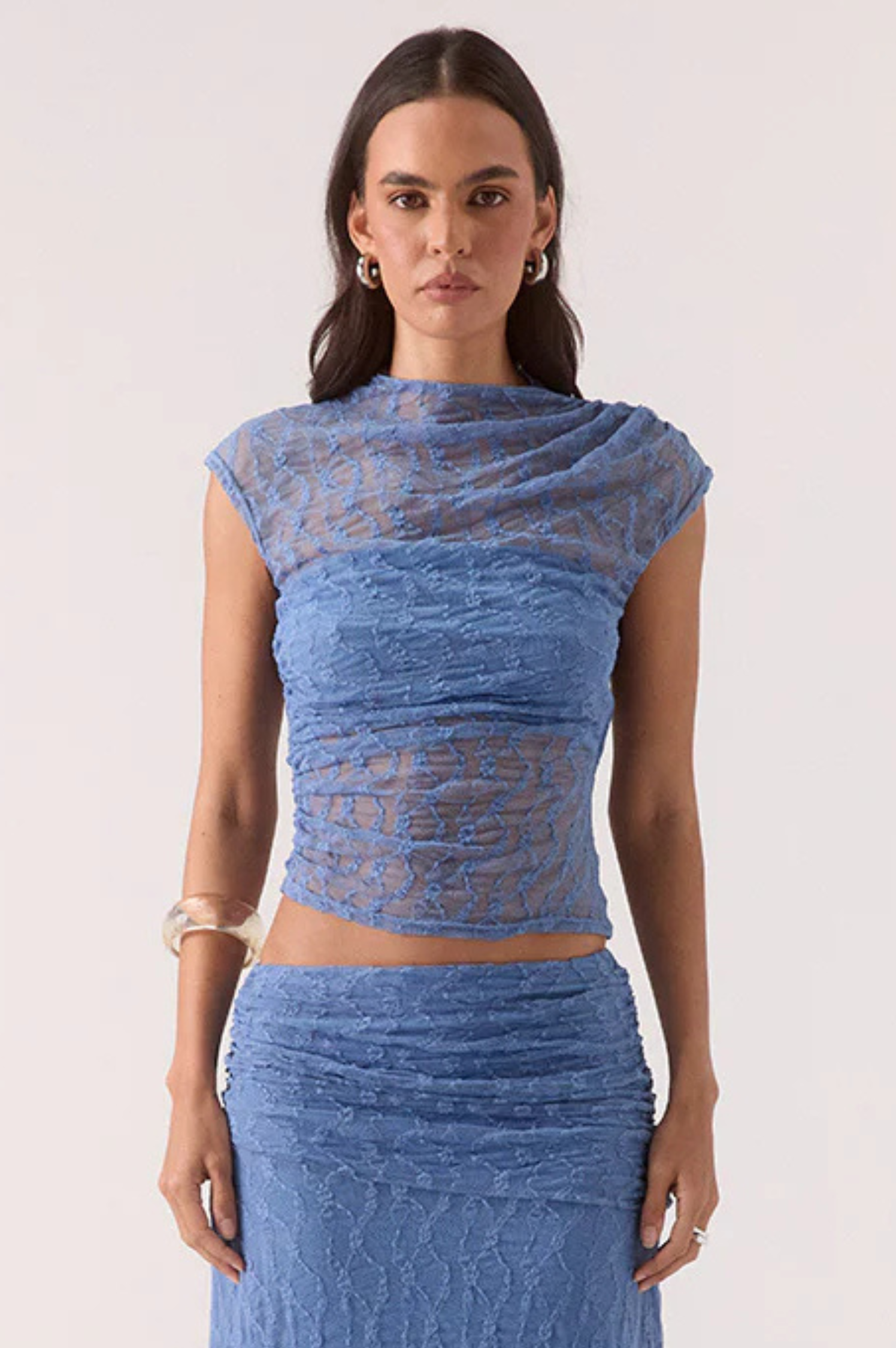 • The Lowri Top is a sleeveless blue top is crafted from a delicate, textured lace mesh that features a high, slightly draped neckline and a sheer finish for a modern, ethereal look. The ultimate beach-to-dinner resort look with the matching Lowri Skirt.