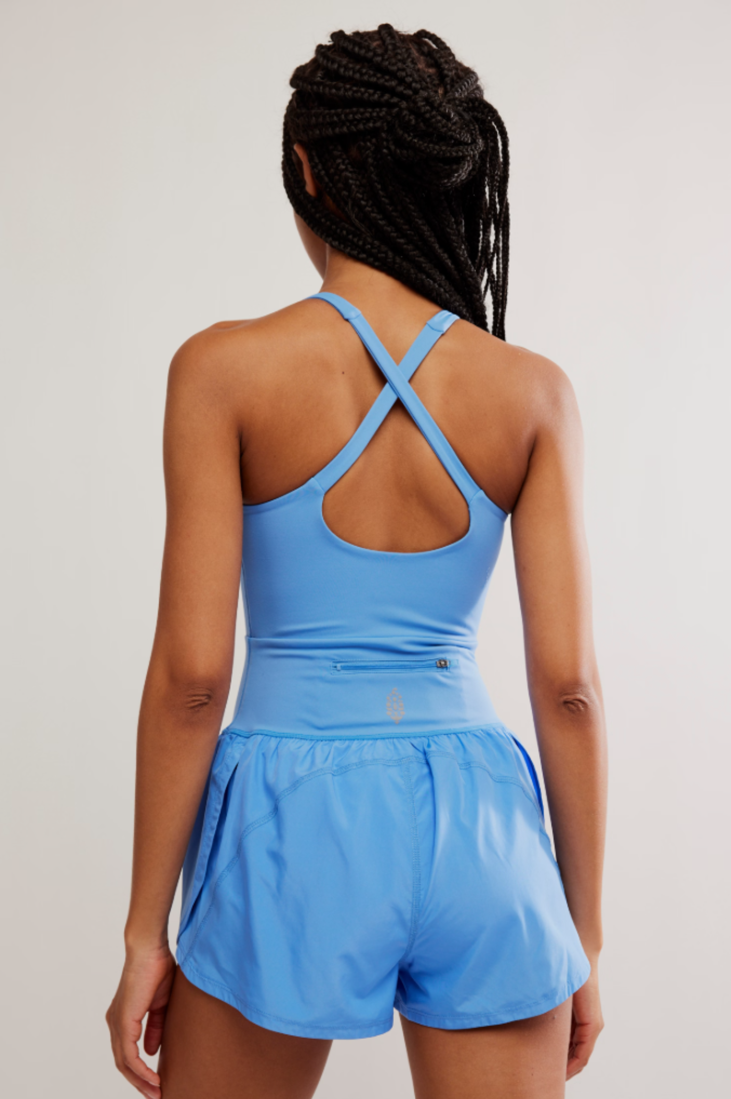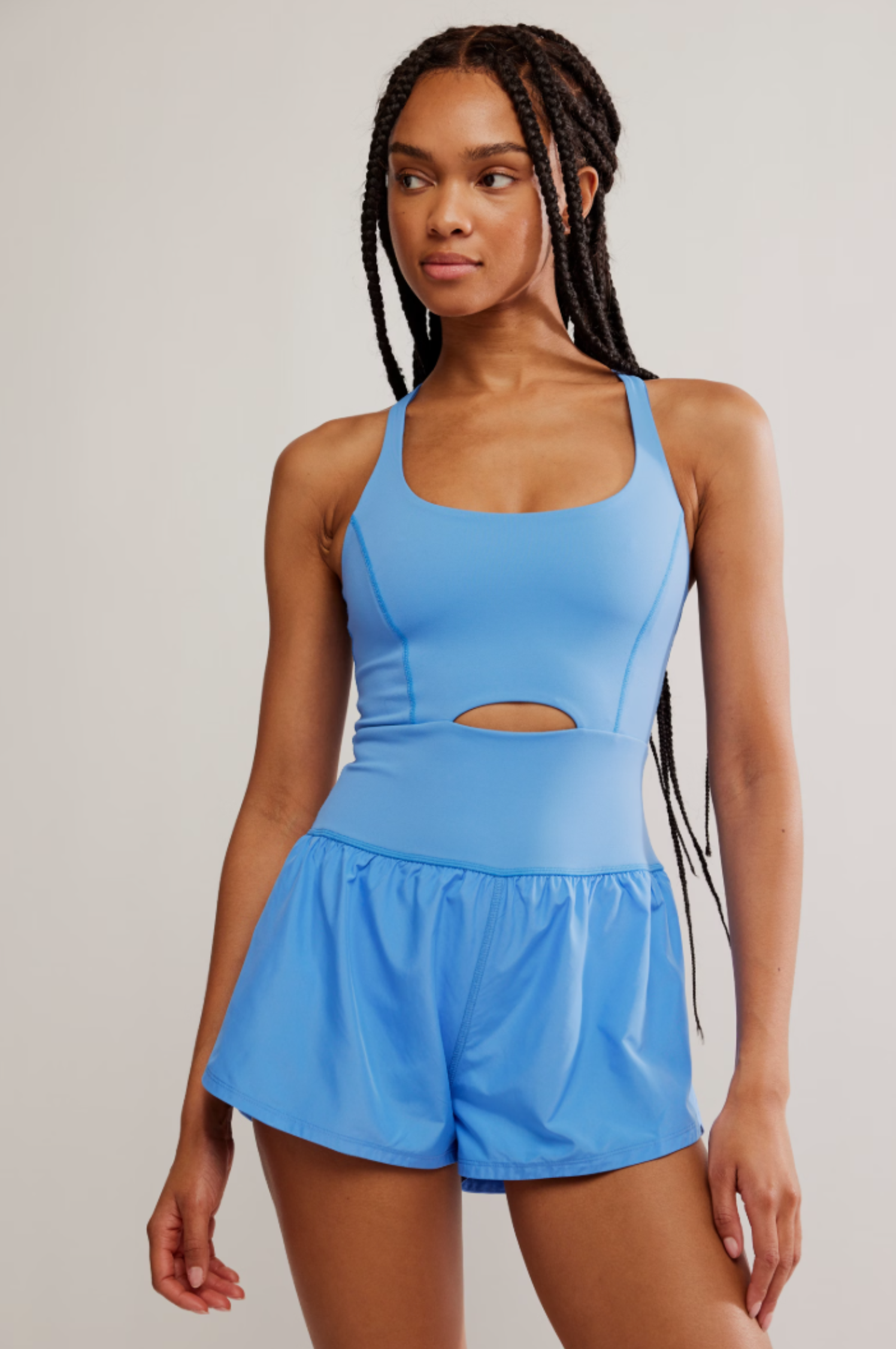 • The perfect one-and-done running outfit, this easy romper features a slim-fitting top with a cooling cutout at the center paired with airy retro-style shorts.