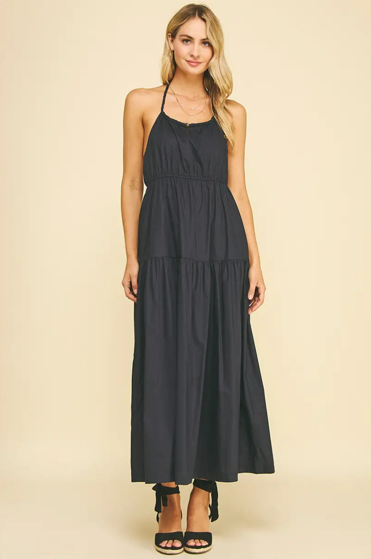 • The tiered Amanda Maxi Dress features an open back for a breezy, romantic feel. Perfect for warm-weather events, it’s an effortlessly elegant statement piece.