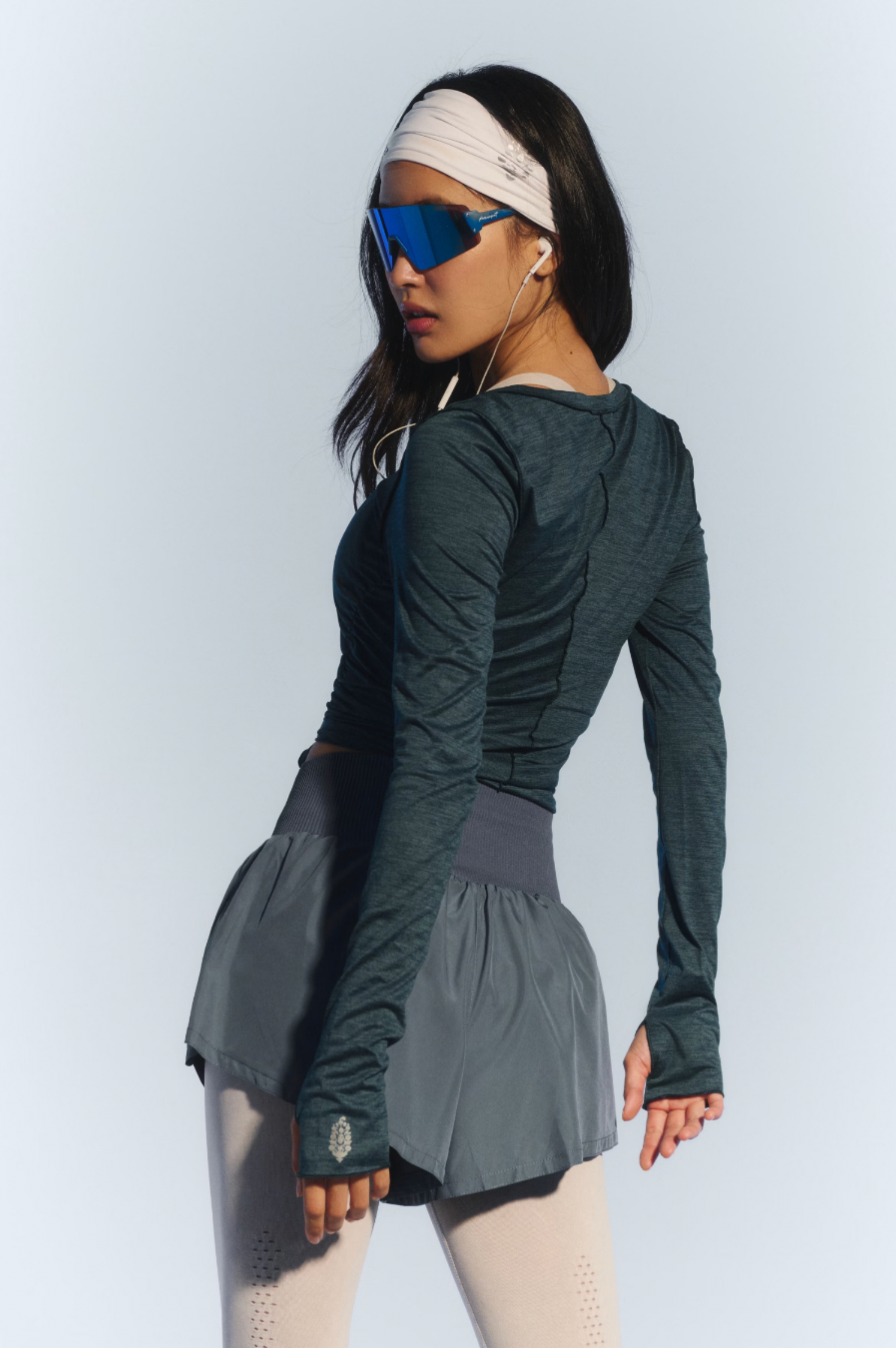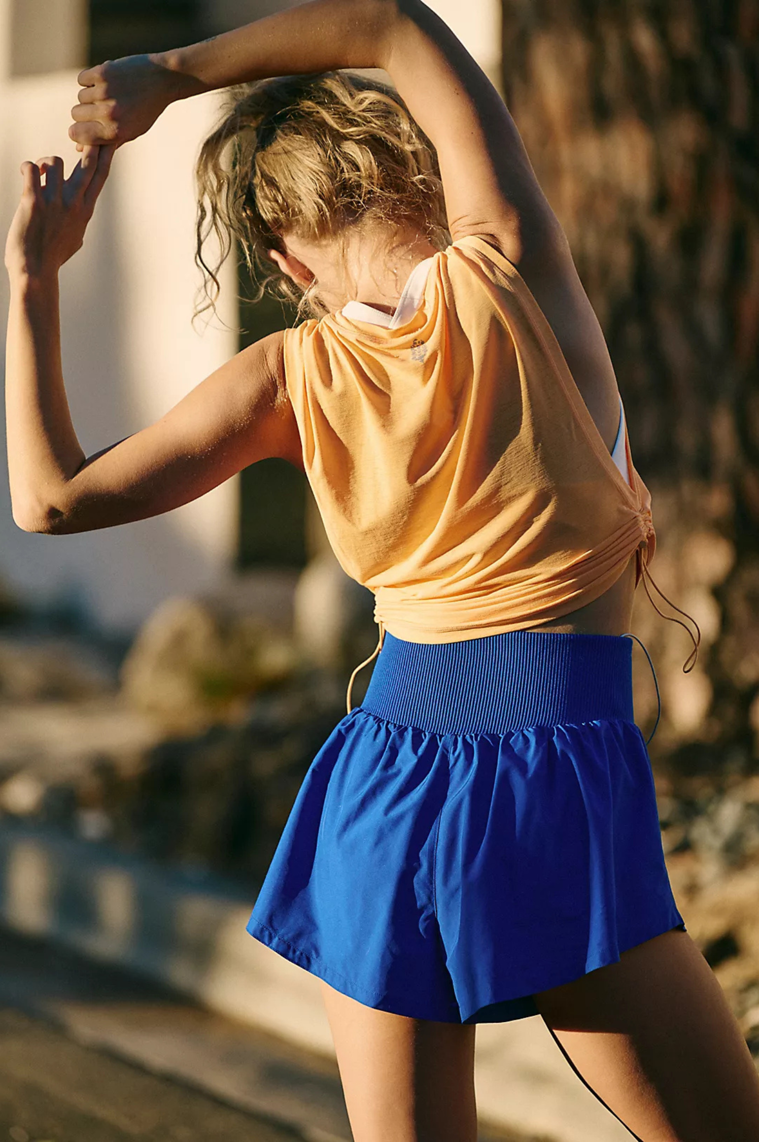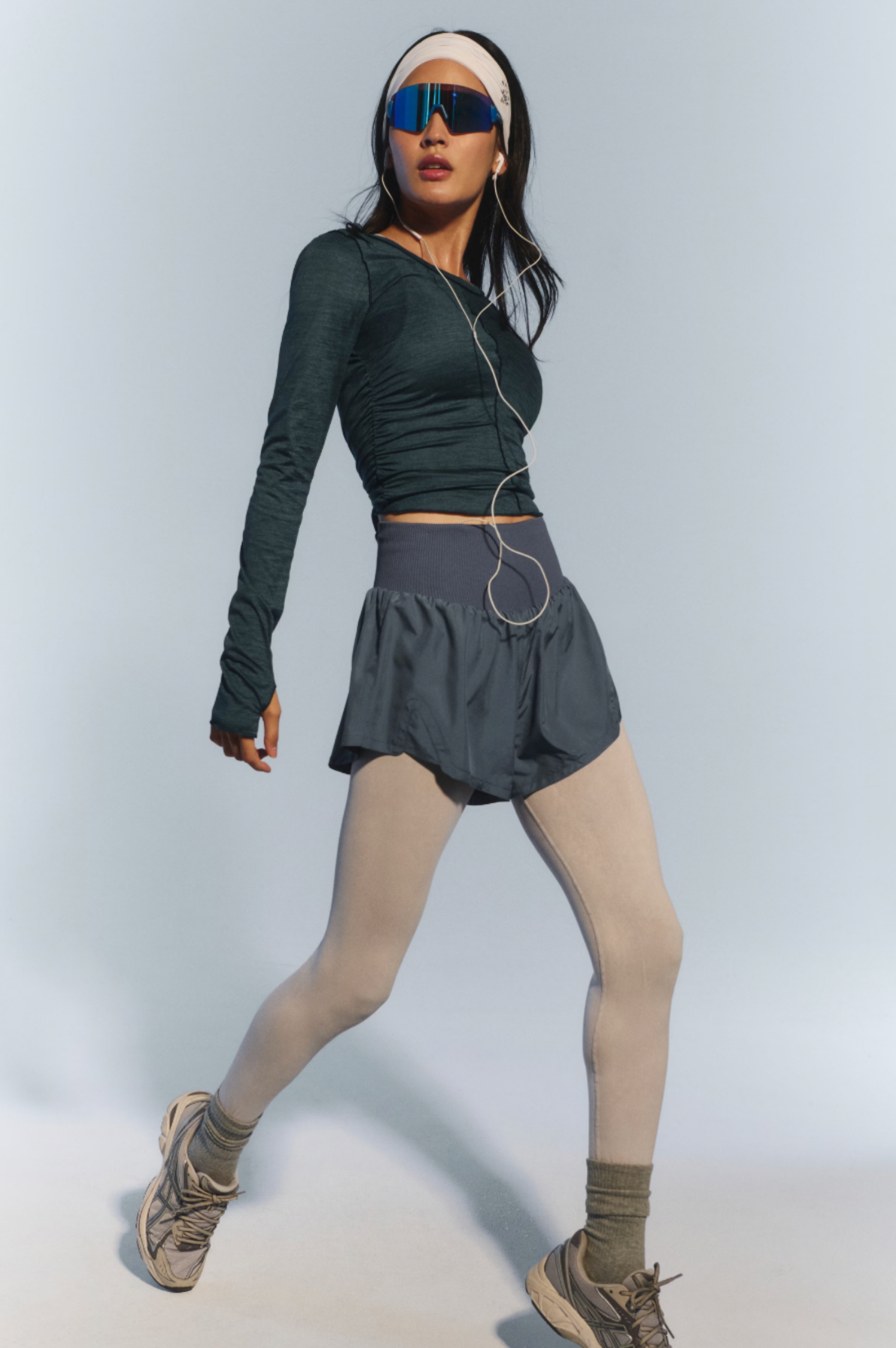 • Seize the run in these so-flattering shorts, featuring a durable, water-resistant fabrication, built-in briefs and a knit high-rise waistband.
