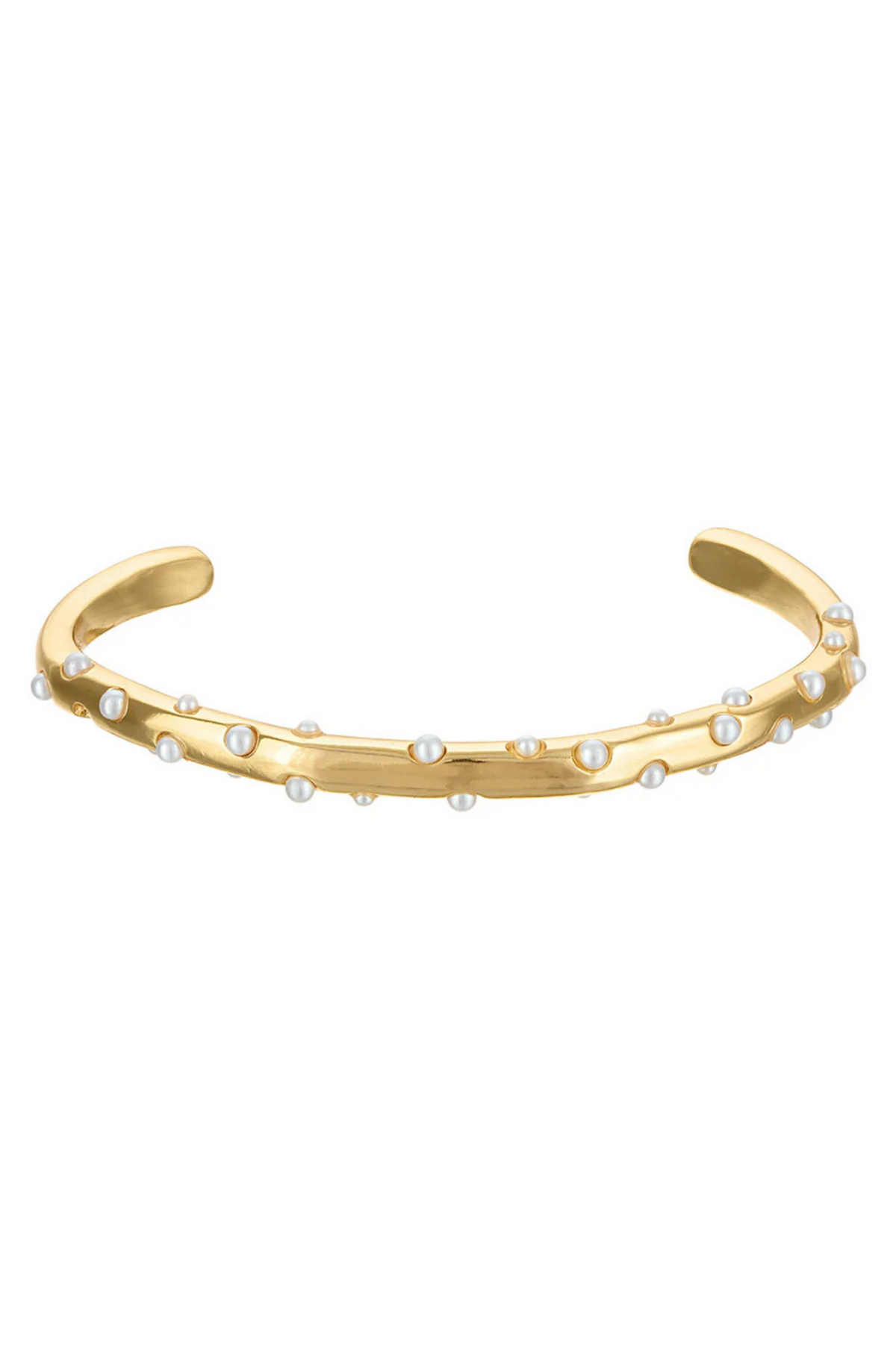• Add a statement of refined beauty with the Johanna Pearl Cuff Bracelet. Impeccably designed, this wristlet blends lustrous gold with pearl accents.